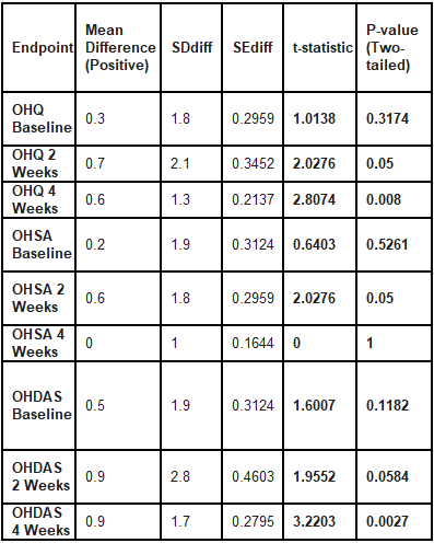 Running a paired sample t-test on the difference scores does yield statistically significant results on many of the endpoints.