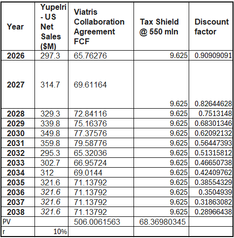 Updated YUPELRI Asset Value + Tax Shield: ~$550M