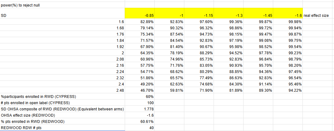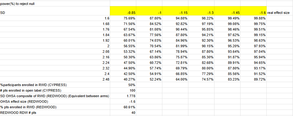 I used Z distribution instead of a t distribution, but at n=30 per arm the real results are relatively close. I am confident-ish that this is really close to the study’s actual powering since management guided that CYPRESS is 90% power to detect MCID change (-1 OHSA point) with variability observed in previous study (Roughly 1.74 single arm SD assuming equal variance between arms).