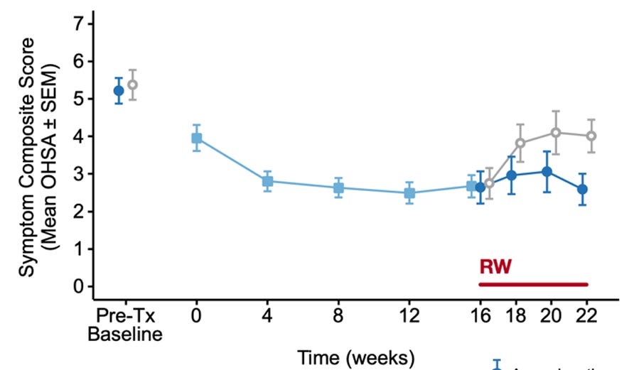 Alternatively, increased enrollment might not have been needed, as the open-label extension trial has a week 0 visit — or at least the previous one had — so management is able to access pre-withdrawal scores and post withdrawal scores, providing them with the necessary information to keep the powering at an adequate level. Regardless of whether management has access to patient-level or only pooled data, my point still stands.